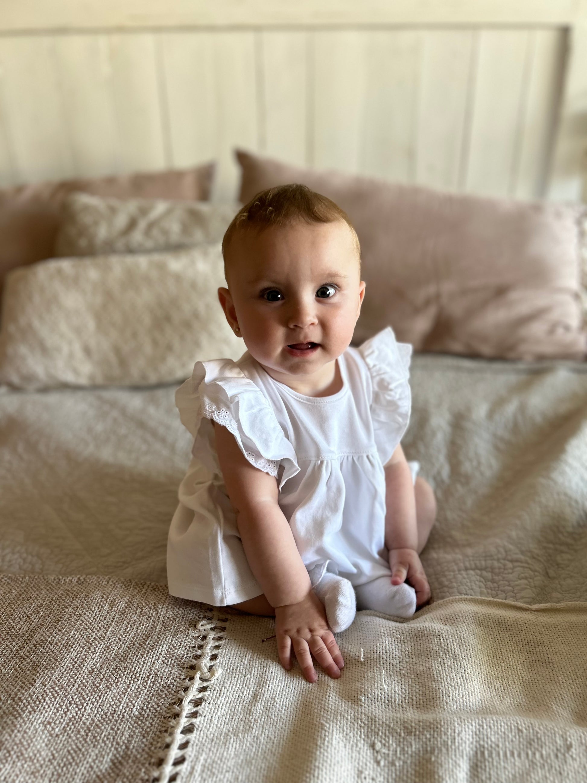 Vestido blanco con vuelo y blonda en las mangas en 100% algodón pima peruano. Una opción fresca y linda para este verano.